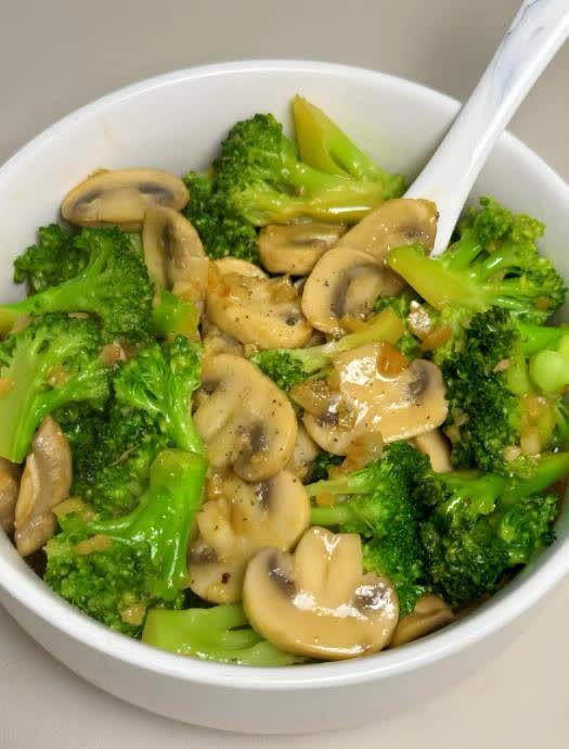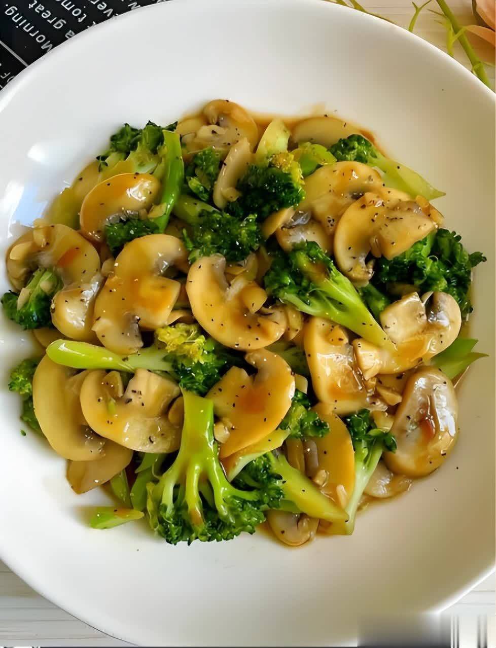 5. 加入西兰花:将焯过水的西兰花加入锅中,与口蘑一起翻炒均匀,继续翻炒2-3分钟。
