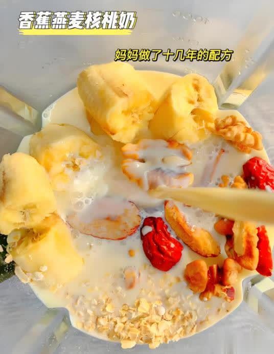 3. 混合香蕉与液体:将切好的香蕉段放入搅拌机中,加入已经浸泡好的燕麦和牛奶(如果觉得液体不够,可以适量添加更多的牛奶或植物奶)。